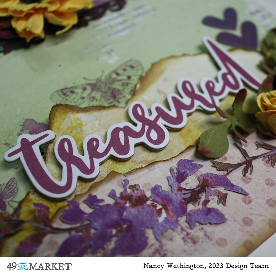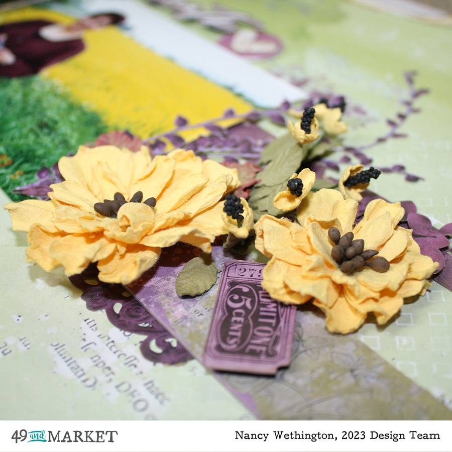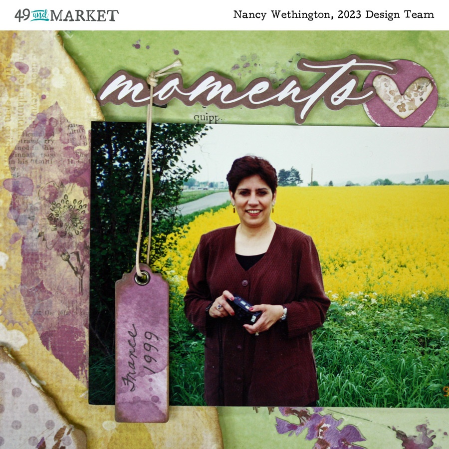 Glad to be with you again for my 49 & Market Design Team project. I don’t often (or like to) create layouts with my photos but I’ve loved this picture of Safflowers in France for years. And when I saw the ARToptions Plum Grove Collection, I had to use it.