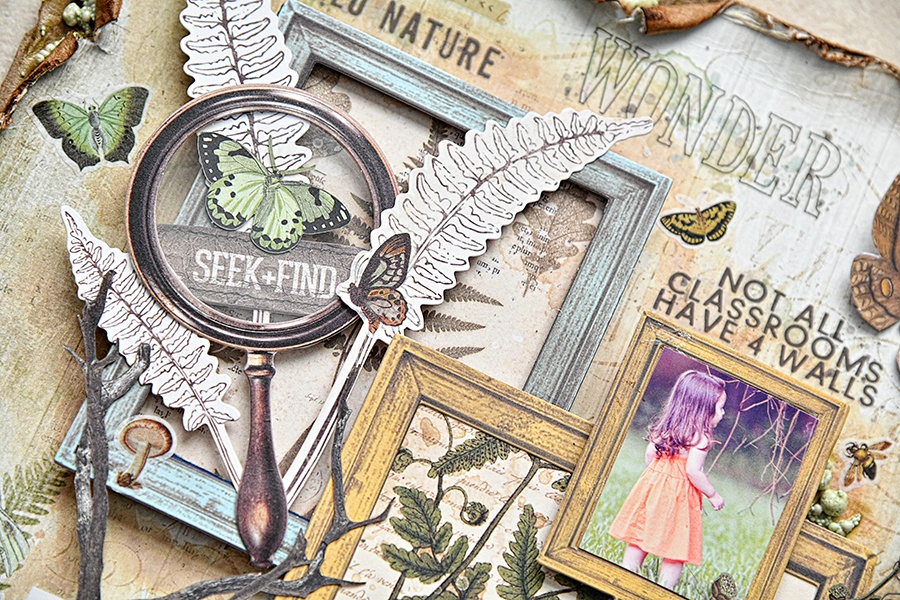 I love the jar in the Ephemera Bits pack, as it reminds me of the jars, we used to catch fireflies when we were kids. I chose to stuff it with Mushrooms, a butterfly, and moss on the bottom. Then I cut out a piece of acetate and covered the jar. I tied a piece of jute around the jar and topped the jar with a tiny ladybug. I scattered mushrooms all around the layout. There are so many different varieties and colors. I used Ephemera Bits, Laser Cuts, and washi sticker mushrooms.